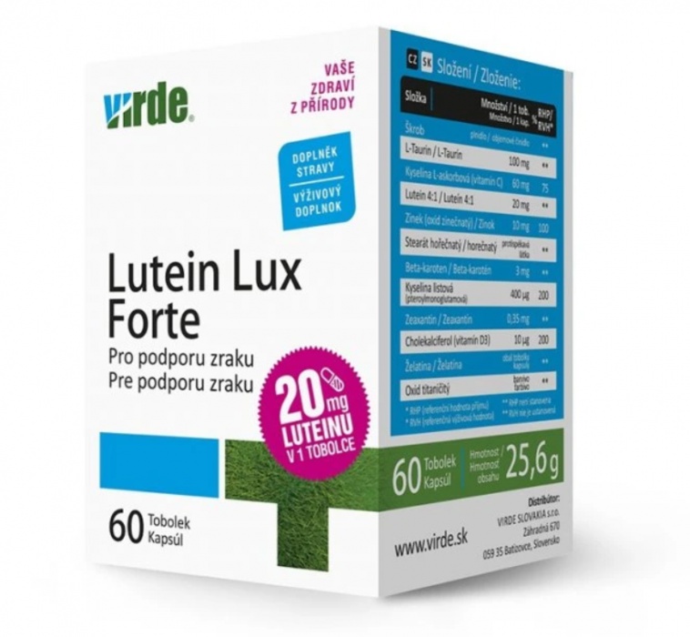 Přípravek Lutein LUX Forte je určen pro podporu zraku. Obsahuje 20 mg luteinu v 1 tobolce.